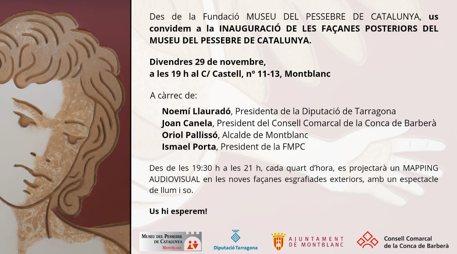 El passat divendres 29 de novembre, el Museu del Pessebre de Catalunya de Montblanc ha celebrat la inauguració oficial de les seves façanes posteriors, recentment remodelades. L’acte ha tingut lloc a les set de la tarda i ha comptat amb els parlaments institucionals del director del Museu, Ismael Porta; del president del Consell Comarcal de la Conca de Barberà, Joan Canela; de la presidenta de la Diputació de Tarragona, Noemí Llauradó, i de l’alcalde de Montblanc, Oriol Pallissó.